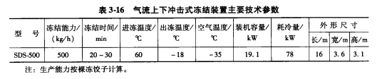 高速氣流垂直吹向不銹鋼網帶上的被凍食品,使其表層很快冷卻。被凍食品的上部和下部都能均勻降溫,達到快速凍結。這種凍結裝置是20世紀90年代美國約克公司開發出來的。我國目前也有類似產品,并且將靜壓箱出口處設計為條形風道,不用噴嘴,風道出口處的風速可達15m/s。氣流上下沖擊式凍結裝置主要技術參數見表3-16。