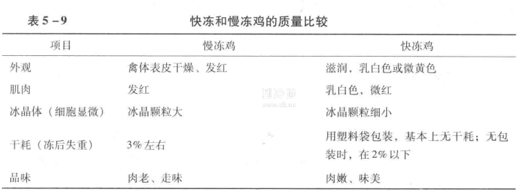 總之,快速凍結的禽類,不僅制品外觀色澤佳,而且內在質量好,商品干耗大大降低。快凍與慢凍雞的質量比較情況見表5-9