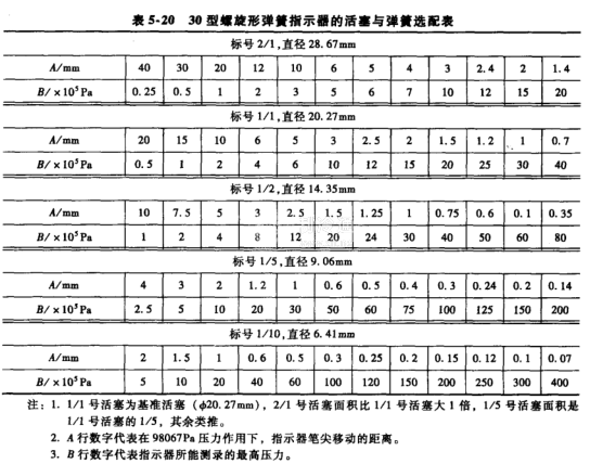為適應各種不同氣體壓力,指示器備有成套不同尺寸的小活塞和不同剛度的彈簧,各型指示器內均附有彈簧和活塞直徑選用表,以便選用。表5-20為30型螺旋形彈簧指示器的活塞與彈簧選配表。