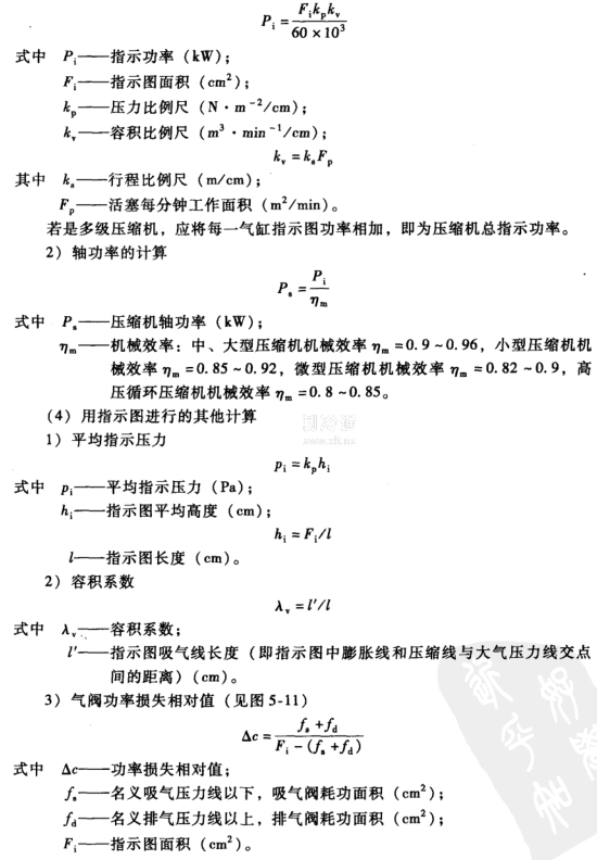 2.測定壓縮機指示功率確定其軸功率錄取活塞式壓縮機的指示圖(或稱示功圖)是反映壓縮機在一個工作循環中,活塞在每個位置時氣缸內氣體壓力變化的曲線。根據指示圖,就可對壓縮機的工作過程作一系列的分析和計算。例如根據指示圖面積可計算出缸內平均指示壓力、指示功率及氣閥功率損失:根據吸入線長度可計算出氣缸容積系數入,;根據最高和最低壓力,可求出缸內實際壓力比;根據氣體壓力所產生的作用力,可作為動力及強度復核計算的依據。另外,在指示圖上還可以分析判斷氣閥、活塞環、填料函等泄漏情況,吸、排氣過程壓力損失情況,壓縮和膨張過程的熱交換情況等,進而根據這些分析判斷來排除壓縮機某些故障(見第4章的4-11問答)。由此可見,使用儀器錄取及分析壓縮機指示圖,是研究壓縮機運行工況的一種方法。