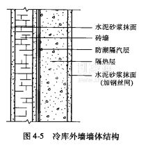 冷庫外墻由圍護墻體、防潮隔汽層、隔熱層和內保護層等組成(見圖43)。