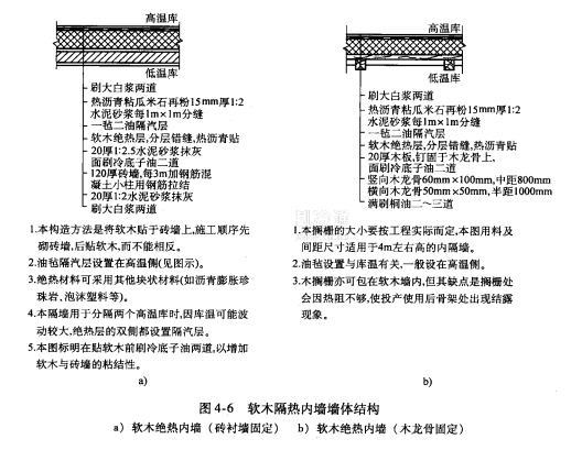 <5℃的場合,一般采用240mm或120mm厚的磚墻,兩面水泥砂漿抹面(不隔熱內墻不得破壞吊頂隔熱)。隔熱內墻多采用塊狀泡沫混凝土作襯墻,再做隔熱和防潮,以水泥砂漿抹平,并應注意隔熱層的連續性。隔熱內墻的防潮隔汽層多設在墻壁熱側,亦可兩側均敷設。如圖4-6所示為冷庫軟木隔熱內墻墻體結構。