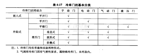 冷庫門可按冷間的性質分類,分為高溫庫冷庫門、低溫庫冷庫門和氣調庫冷庫門等。常用的分類方式是以冷庫門的結構和開啟形式及冷庫門的啟閉動力等來分類。冷庫門的基本分類見表4-17。