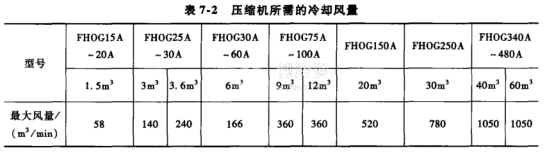 導風管可以水平或垂直安裝,排風的壓力損失不大于6mm水柱,否則應增加排氣扇。其抽風量不小于壓縮機所需的冷卻風量,如表7-2所示。