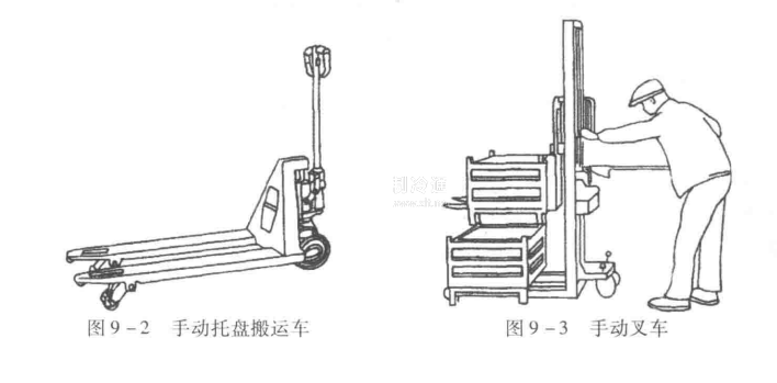 9-2為手動(dòng)托盤搬運(yùn)車,它用于搬運(yùn)裝載與托盤貨托架上的冷藏品。當(dāng)貨叉插入托盤或托架后,上下?lián)u動(dòng)手柄,使液壓千斤頂提升貨叉,托盤或托架就隨之離地。當(dāng)物品運(yùn)到目的地后,踩動(dòng)踏板,貨叉落下,放下托盤或托架。該搬運(yùn)車適合于短距離的水平搬運(yùn)作業(yè),它靈活、輕便。圖9-3為手動(dòng)叉車,它是一種利用人力提升貨叉的裝卸、堆垛和搬運(yùn)多用車,適合用于工廠車間、冷庫內(nèi)需要一定起升高度的搬運(yùn)作業(yè)。