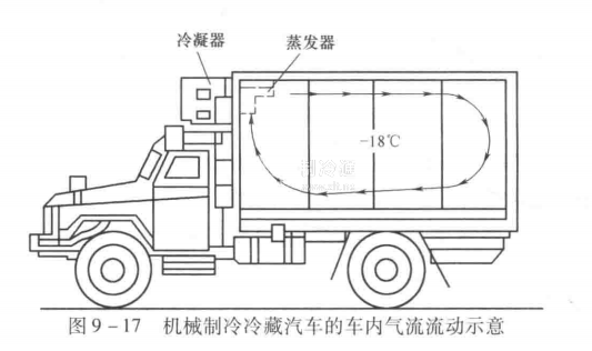 空氣冷卻器通常安裝在車廂前端,采用強(qiáng)制通風(fēng)方式。冷風(fēng)貼著車廂頂部向后流動(dòng),從兩側(cè)及車廂后部下到車廂底面,沿底面間隙返回車廂前端。這種通風(fēng)方式使整個(gè)食品貨堆都被冷空氣包圍著,外界傳入車廂的熱流直接被冷風(fēng)吸收,不會(huì)影響食品的溫度。為了形成上述冷風(fēng)循環(huán),食品要堆放在木板條上,在貨垛的頂部與四圍留有一定的間隙,作為冷空氣循環(huán)通路。圖9-17為機(jī)械制冷冷藏汽車的車內(nèi)氣流流動(dòng)示意。