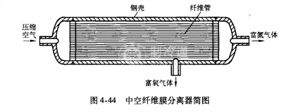 中空纖維制氨機(jī)這種機(jī)器利用氣體對(duì)膜的滲透系數(shù)不同而進(jìn)行氣體分離。中空纖維制氮機(jī)的關(guān)鍵是膜分離器,其結(jié)構(gòu)見(jiàn)圖4-44,它由耐壓的鋼殼和中空纖維管束組成,每根中空纖維管的管壁,即為起分離作用的膜,管壁厚約100um。其中位于管外表處的活性分離層只有幾個(gè)微米厚,余下的是疏松的多孔支承層,每臺(tái)膜分離器內(nèi)的中空纖維管數(shù)多達(dá)數(shù)萬(wàn)根至數(shù)十萬(wàn)根。