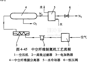 以自動(dòng)控制,由電加熱器出來(lái)的壓縮空氣進(jìn)入中空纖維膜分離器,出來(lái)的富氨氣體經(jīng)水冷卻器5降溫,最后經(jīng)恒壓閥6減壓,返回氣調(diào)庫(kù)。膜分離器的鋼殼外設(shè)一定厚度的隔熱層,以保證其所需的工作溫度和減少工作溫度的波動(dòng)。