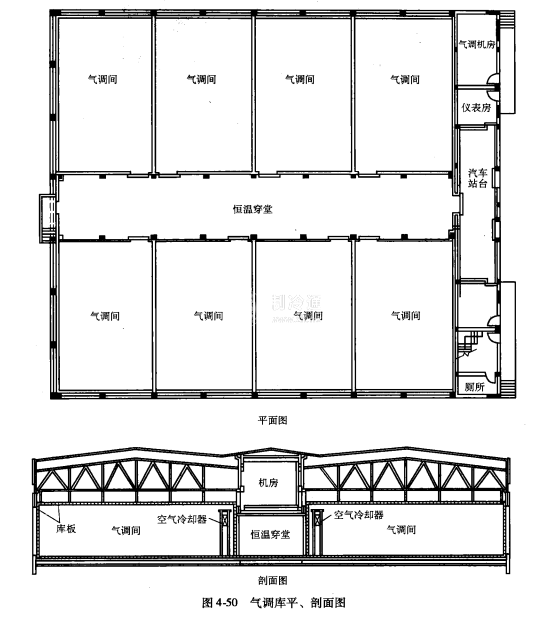 氣調庫第一期工程主要先建造800t氣調庫(不包括挑選、包裝間),其平剖面布置見圖4-50.平面圖上示出八個氣調間及恒溫穿堂,氣調設備置于氣調機房,電腦控制設備置于儀表房內,汽車站臺為封閉式,溫度保持在5~7℃。