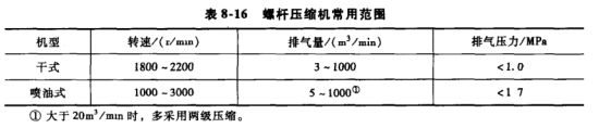 螺桿壓縮機為強制輸氣,且對變工況有很好的適應性;幾乎完全平衡,要求的基礎很?。航Y構緊湊,零件少,壽命長,維護管理簡單,易于實現遠距離操縱或自動化。但螺桿壓縮機的轉子型線復雜、加工要求較高、噪聲較大,適用于中低壓及中小排氣量,如表8-16所示。