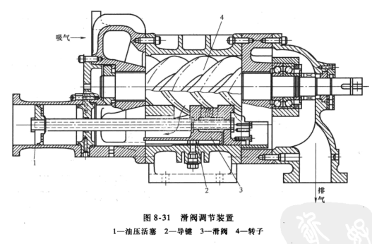 在氣缸排氣側(cè)的兩內(nèi)孔交接處安裝滑動(dòng)調(diào)節(jié)閥(滑閥)。滑閥能在氣缸軸線平行的方向來(lái)回移動(dòng),它是靠油壓活塞的推動(dòng)進(jìn)行連續(xù)無(wú)級(jí)調(diào)節(jié)的(圖8-31)。