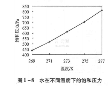 真空預(yù)冷是降低水的沸點(diǎn),靠水分蒸發(fā)帶走產(chǎn)品的熱量的冷卻方法。1個(gè)大氣壓下水的沸點(diǎn)是100℃。氣壓下降,水的沸點(diǎn)會(huì)隨之降低,大約600Pa時(shí),水的沸點(diǎn)變成0℃。真空預(yù)冷就是利用這一原理,將果蔬放在密閉容器內(nèi),改變?nèi)萜鲀?nèi)的氣壓,在低壓下果蔬蒸發(fā)旺盛,靠水分蒸發(fā)帶走大量蒸發(fā)熱,將果蔬冷卻。圖1-8列出了水在不同溫度下的飽和壓力。