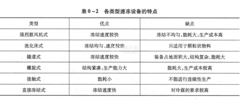 速凍是運用現代凍結技術在盡可能短的時間內將食品溫度降低到其凍結點以下(預期溫度通常為-18℃)的技術。該技術使食品所含的全部或大部分水分隨著食品熱量外散而形成微小冰晶體,不嚴重損傷細胞組織,能最大限度地減少生命活動和生化變化所必需的液態水分,保留食品的天然品質,為低溫凍藏提供良好基礎。目前,我國的速凍設備可分為強烈鼓風機式、流化床式、隧道式、螺旋式、接觸式及直接凍結式六大類型,其中前四種采用的是空氣強制循環方式,接觸式速凍屬于板式熱交換方式,直接凍結式速凍采用液體汽化制冷方式。各類型速凍設備的特點如表0-2所示。