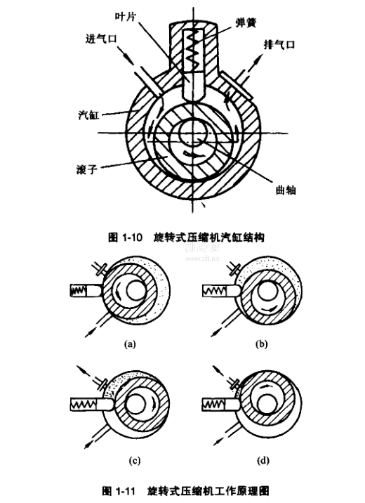 旋轉(zhuǎn)式壓縮機的工作過程,見圖1-10和圖1-11所示,圓柱活塞(轉(zhuǎn)子)和葉片靠彈簧的作用緊密相貼,從而在汽缸內(nèi)形成高壓腔和低壓腔兩個空間。轉(zhuǎn)子每轉(zhuǎn)動一周,就完成壓縮一排氣一膨脹一吸氣一個循環(huán),從而把低溫低壓氣體壓縮為高溫高壓氣體。