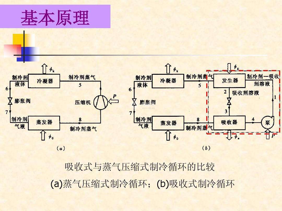 制冷就是用人工的方法將某一物體或空間的熱量帶走,使該物體或空間的溫度低于周圍的溫度。制冷的方法有多種,目前最廣泛的是采用蒸氣壓縮式制冷,其基本原理是利用工作物質(簡稱工質,即制冷劑)狀態變化時的吸熱和放熱來實現制冷。空調器就是利用液體蒸發為氣體時吸收熱量的原理使室內空氣降溫,如人們在暖和的天氣里游泳后會感到涼快,這是因為附在人體上的水蒸發時吸收人體的熱量的緣故。液體由液態變為氣態時會吸收大量的熱(相變潛熱),空調、冰箱、冷庫等制冷設備就是利用液態制冷劑汽化吸熱來制冷的,具體來說就是利用制冷工質(如氟里昂)汽化時可吸收大量的熱來實現制冷的。夏天室外溫度比室內溫度高,要把室內熱量移到室外,得借助人為的方法,制冷壓縮機就是這樣一種實現熱量傳遞的裝置。