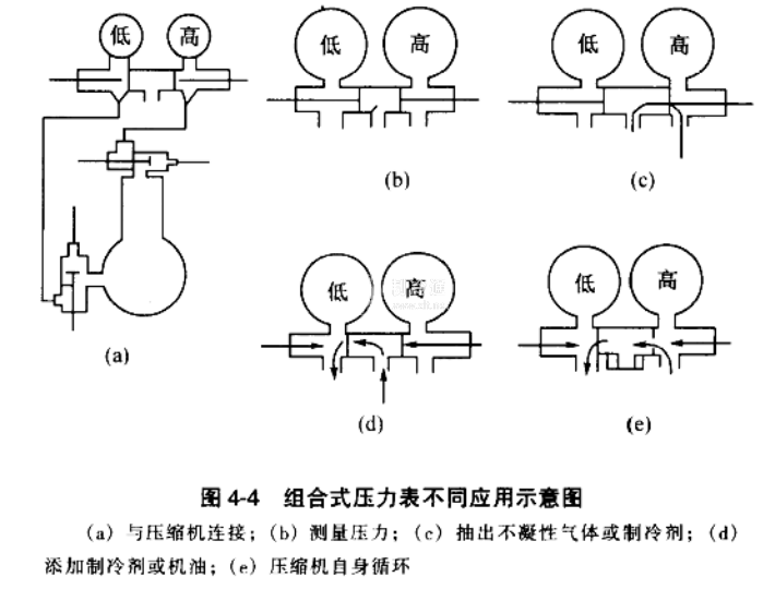在閥體接頭的中間有一個試驗用接頭,分別與閥體接頭左右兩邊的低壓表和高壓表及其相應的連接管相通。其通道由各自在閥體接頭上的手動截止閥控制。如果兩個手動截止閥關閉,則兩壓力表與中間的試驗用接頭切斷。壓力表指示的壓力就分別為系統的低壓側和高壓側壓力。若打開某一側的手動截止閥,則試驗用接頭及其所連的接管就與這一側的壓力表相通。通過閥體接頭上的兩個手動截止閥的調節,就可以操作組合式壓力表,如圖4-4所示,進行如下的操作:①與壓縮機連接;②測壓力用;③抽取制冷劑或排放空氣;④充加制冷劑或機油;⑤壓縮機自身循環。