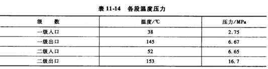 3)出口溫度高某二級往復(fù)壓縮機,新機開車運行檢查各部運行參數(shù),發(fā)現(xiàn)二段出口溫度超過150℃,接近報警值。檢查二段出入口閥,未發(fā)現(xiàn)問題;檢查托環(huán)漲圈,也未發(fā)現(xiàn)問題。各段溫度壓力如表11-14所示。