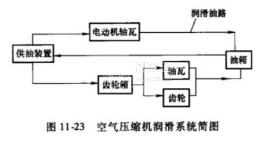 空氣壓縮機供油系統的油箱容積5000L,正常操作液位為1.14m,最低操作液 Llm,液壓泵供油量49. 08m3/ho每小時把油箱里的潤滑油循環10次,通過油 過濾器、油冷卻器后向,壓縮機電動機軸瓦、機組齒輪、各軸承等部件進行強制潤 滑,并帶走熱量。潤滑系統全部組件置于座形方油箱周圍,構成集中式供油系統。 另外,配置了一臺功率2kW的電動 機帶動排煙風機,把潤滑系統產生 的油煙經油氣分離器過濾后排入大 氣。這樣可以保證機組油箱、齒輪 箱內負壓,從而達到各潤滑點不向 外滲油、漏氣,潤滑油潤滑后快速 回流油箱,如圖11-23所示。