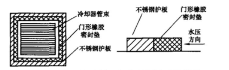 急針對冷卻器進排水口門形橡膠密封墊的設計缺陷,增加不銹鋼護板,以減 少門糖橡膠密封墊跑偏的可能性,如圖11-30所示。