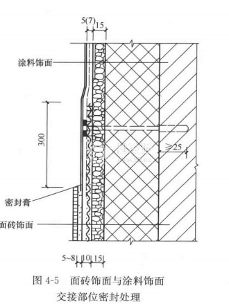 面磚飾面與涂料飾面交接部位防水密封處理,如圖4-5所示。