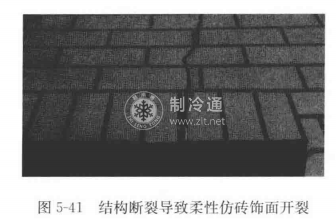 (3)外力(如地基)沉降不均勻、地震力等原因造成墻體開(kāi)裂、錯(cuò)位變形,不可抗力導(dǎo)致防護(hù)層開(kāi)裂、破壞。如柔性仿磚飾面保溫系統(tǒng),因窗口上方出現(xiàn)結(jié)構(gòu)開(kāi)裂而導(dǎo)致柔性仿面磚飾面開(kāi)裂現(xiàn)象,如圖5-41所示。