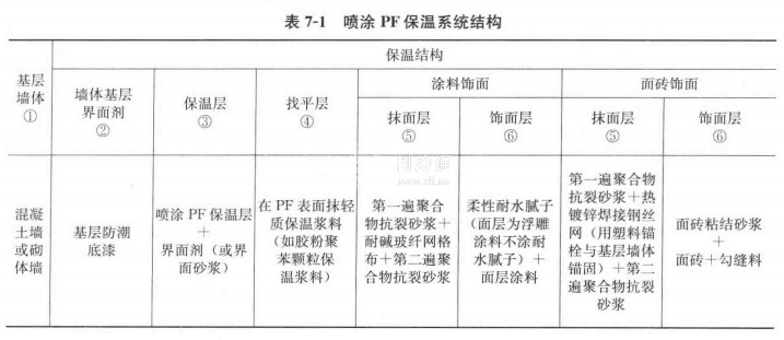 噴涂P℉保溫涂裝飾面和面磚飾面系統的基本結構如表7-1所示。