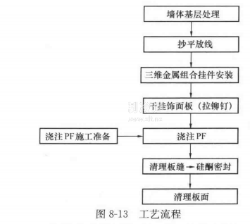 2. 干掛飾面板現(xiàn)場(chǎng)澆注酚醛泡沫的工藝流程,如圖8-13所示。