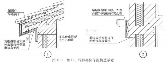 檐口、線腳部位保溫構造,應采取外保溫方式(如粘貼PF保溫板或擠塑板),防止產生熱橋,如圖10-7所示。