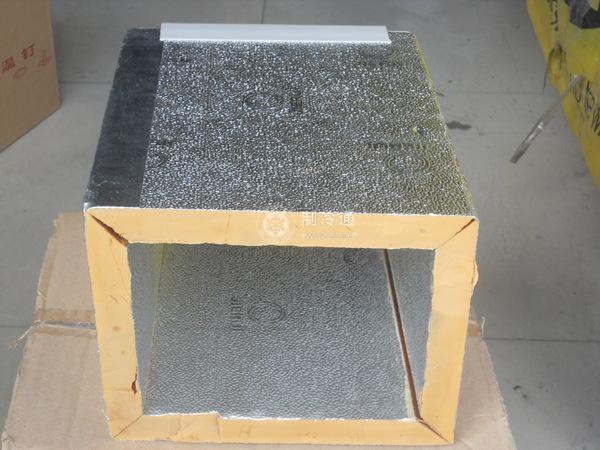 鋁箔(或金屬壓花金屬板)復(fù)合酚醛泡沫板空調(diào)風(fēng)管,首先是在生產(chǎn)線上由PF板與兩面帶有凹凸紋狀的鍍膜鋁箔連續(xù)壓制成型夾心板,再通過(guò)組裝后完成空調(diào)風(fēng)管。