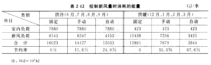 對于營業中的商場,使用中的候車室、候船室、候機廳等,由于其室內人員變動較大,可以采用手動或二氧化碳濃度檢測器自動控制新風閥的方法,根據室內人數的變化情況,相應調節新風閥,控制新風的最少使用量,來達到節能的目的。表2-12所示為某百貨商場新風調控方法的比較結果。新風閥分別為固定、手動半開和二氧化碳濃度檢測器自動控制三種情況。從表中數據可以看出,新風量調節比不調節好,自動調節比手動調節好。