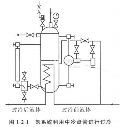 現(xiàn)在普遍采用高壓液體制冷劑通過中間冷卻器的冷卻盤管來過冷,如圖1-2-1所示。