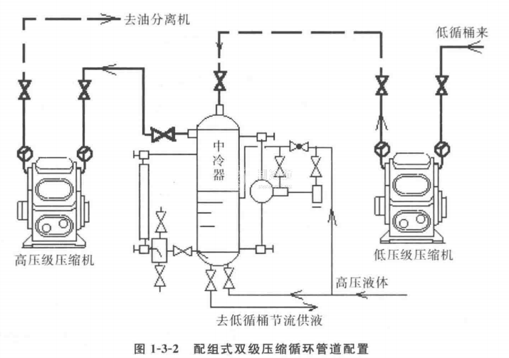 雙級壓縮制冷系統,可采用單級壓縮機配組式,也可選用單機雙級壓縮機。從初次投資費用、機器的占地面積、單位功率制冷量以及機器的操作管理等來比較,采用單機雙級壓縮機比單級壓縮機配組式更合理。但單級機配組式也有其優點:可以通過不同壓縮機的搭配使用,而取得較理想的高低壓輸汽比,從而使其工況更為接近最佳工況。圖1-3-2所示的是由兩臺單級壓縮機配組的連接方案,它只承擔一個蒸發溫度的熱負荷。蒸發器的回汽,先經低壓級壓縮機吸入,壓縮到中間壓力進入中冷器,經冷卻降溫后中壓氣體再被高壓級壓縮機吸入壓縮至冷凝壓力。