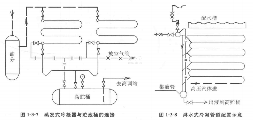 1-3-7所示的是蒸發式冷凝器的管道配置示意。由于制冷劑通過蒸發式冷凝器盤管時的壓力損失較大,若多臺并聯運行時,有可能因壓力損失相差過大而發生排液不暢。所以在管道安裝連接時應采取一些措施,當與其他型式的冷凝器并聯使用時也是如此
