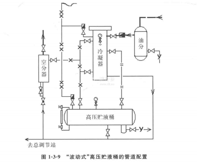 所謂“波動式”,就是當制冷系統的回氣量與供液量相等時,循環的制冷劑液體則不通過貯液器,而直接送至供液調節站。只有當回氣量與供液量不平衡時,貯液器才起調節作用。如圖1-3-9所示。這種連接方案的優點是:當貯液器的環境溫度比冷凝器高時,可保留冷凝器的過冷度,但易將油帶進低壓回路,這種配置方案常用于船舶制冷裝置中,因為船上機艙的溫度可能高于冷凝溫度。
