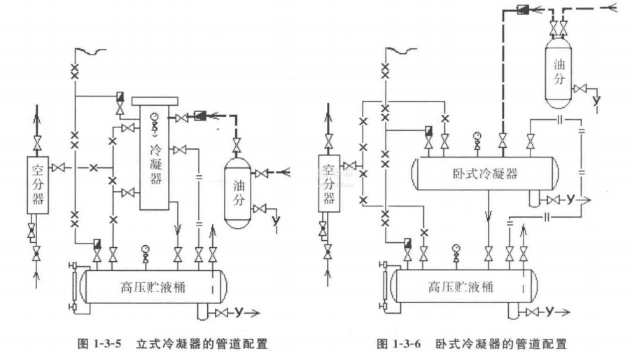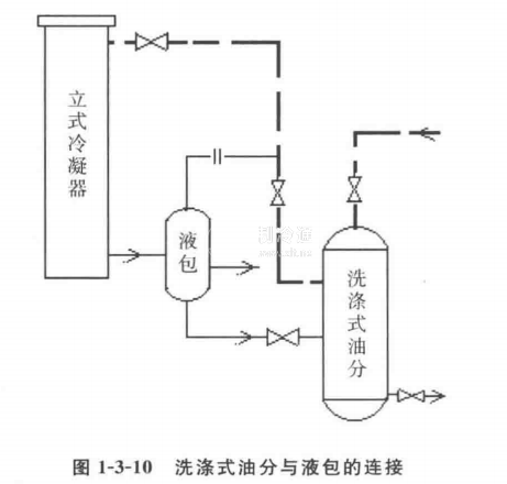 (2) 填料式油分離器:這種油分離器有A型和B型兩種型號(hào),其特點(diǎn)是分油效率高,適于安裝在室外。其中A型油分上還帶有冷卻水套,不僅提高了分油效率,而且還可得到溫度較高的熱水,有利于能源的回收,其管道配置見圖1-3-6。