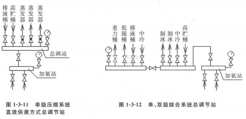 總調(diào)節(jié)站的作用,是向低壓制冷設(shè)備,如低壓循環(huán)桶、氨液分離器等分配制冷劑液體,并可以根據(jù)負(fù)荷的變化,調(diào)節(jié)和控制供液量。總調(diào)節(jié)站的配置形式基本有兩大類型: