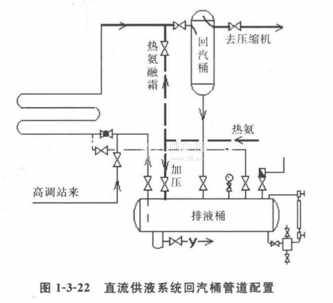 ④為了避免蒸發器回汽中夾帶的液滴引起壓縮機的濕沖程,可在蒸發器回汽管上增設回汽桶和排液桶,如圖1-3-22所示。被分離下來的液體靠位差作用流入排液桶,當桶內液位達一定高度后,對桶內液體進行加壓后再供到蒸發器中去循環使用。若結合設置一些自控元件,則可自動地根據排液桶液位的高低而間斷地代替高壓液體管向蒸發器供液。