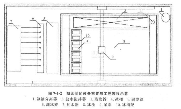 (2)縱向布置  蒸發器布置在冰池一側,兩側邊或中央,使鹽水呈縱向流動,見圖7-1-2,這種布置使鹽水與冰桶的長邊接觸,因而熱交換效果好,但鹽水循環流程較長,單位時間循環次數少些。
