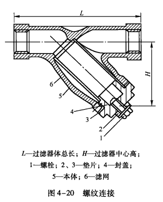 為了防止水管路系統(tǒng)的阻塞和保證水管路系統(tǒng)中的設(shè)備和閥件的正常工作,在管路系統(tǒng)中應(yīng)安裝過濾器,用于清除水中雜物。通常過濾器應(yīng)安裝在水泵的吸入管和換熱器的進(jìn)水管上。過濾器有立式直通式、臥式直通式、臥式角通式及丫形過濾器。工程上常用的是丫形過濾器,它具有外形尺寸小、安裝清洗方便的特點。濾芯采用不銹鋼制成,把水中雜質(zhì)收集起來,用人工以不定期方式清除。丫形過濾器有兩種連接方式:螺紋連接如圖4-20所示;法蘭連接如圖4-21所示。過濾器本體除鑄鋼外,還有銅質(zhì)和不銹鋼產(chǎn)品。