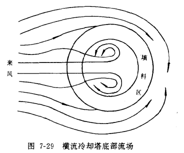 自然通風(fēng)橫流式冷卻塔受風(fēng)作用的模型試驗(yàn)中,測(cè)得塔筒底部的流場(chǎng),見(jiàn)圖7-29。將散熱器垂直安裝在塔筒外周的空冷塔也有類(lèi)似的流場(chǎng)。由圖7-29可見(jiàn),風(fēng)不是直接穿過(guò)塔下部,而在塔內(nèi)形成兩個(gè)對(duì)稱(chēng)漩渦,進(jìn)風(fēng)量不利的區(qū)域不是背風(fēng)面,而是在兩側(cè)。