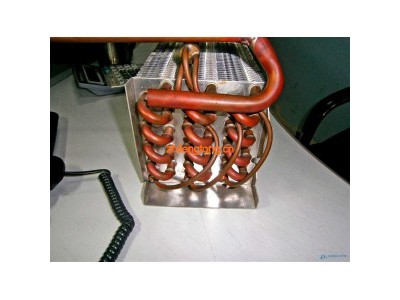 蒸發(fā)器冷風(fēng)機(jī)是由紫銅管和鋁翅片構(gòu)成。蒸發(fā)管采用Ф14.5mm且足夠厚度高品質(zhì)紫銅管,保證漲管后有高度可靠性。紫銅管經(jīng)真空煺火工藝處理,保證高純度和清潔度。鋁翅片是優(yōu)質(zhì)鋁泊經(jīng)精密模具二次翻邊一次成型工藝加工而成,款式為麻點(diǎn)片,較平片提高傳熱效率8%以上。紫銅管和鋁翅片經(jīng)套片、機(jī)械漲管后給合緊密,具有良好的傳熱效率。焊接后經(jīng)三氯乙烯在管內(nèi)的清洗以去除蒸發(fā)管內(nèi)的油污、水份和氧化皮,保證清潔。
